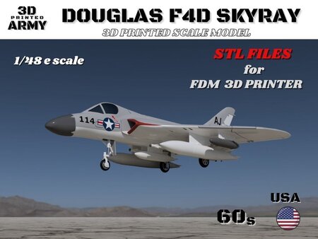 DOUGLAS F4D SKYRAY . It was in service for a relatively short time (1956–1964) and never entered combat but it was the first carrier-launched aircraft to hold the world's absolute speed record at 1211.744 km/h and the first US Navy and US Marines corps fight that could exceed MACH 1 in level flight It's very original and beautiful with his delta wing and equiped with external fuel tank , missiles and rocket pod a small PDF guide is provided to help you to print your model and to assemblr it correctly Take a look to my new Facebook page her : https://www.facebook.com/3DPrintedARMY like it and follow me for lot of new models and my Pinterest page here https://www.pinterest.fr/3DprintedARMY/_created/