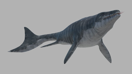 Mosasaurus Hoffmanni model + textures + rig, incl. auto swim function. The maya files contains the rig. This high quality product can be considered a close representation of the extinct animal as palaenthologic experts: Anne Schulp, Johan Lindgren, Takuya Konishi, Michael Polcyn and Dylan Bastiaans have been questioned about the way it looked and moved. The auto swim rig is developed in such a way it mimics a carangiform swim pattern that is believed to be the way the creature moves underwater.