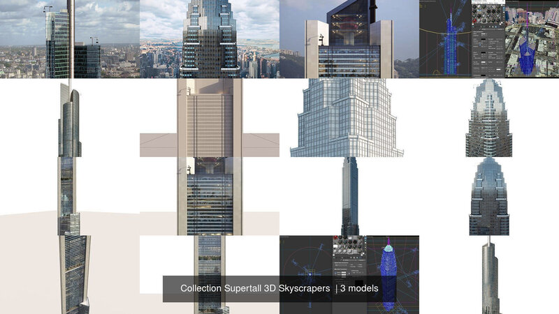 Collection of 3 detailed 3D models of supertall skyscrapers. Original and exclusive designs.