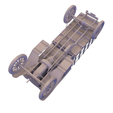 This high resolution 3,263,314 poly CAD model was created in SolidWorks™ from research, field measurements and photographs. It is full-size (1:1) and accurately scaled, with most parts individually modeled. The modeling quality allows for extreme close-ups and rendering. It is ideally suited for hero and foreground shots within early 20th Century period sets and CG’s. There is no motor, only the “basic block” and oil pan that shows under the chassis.