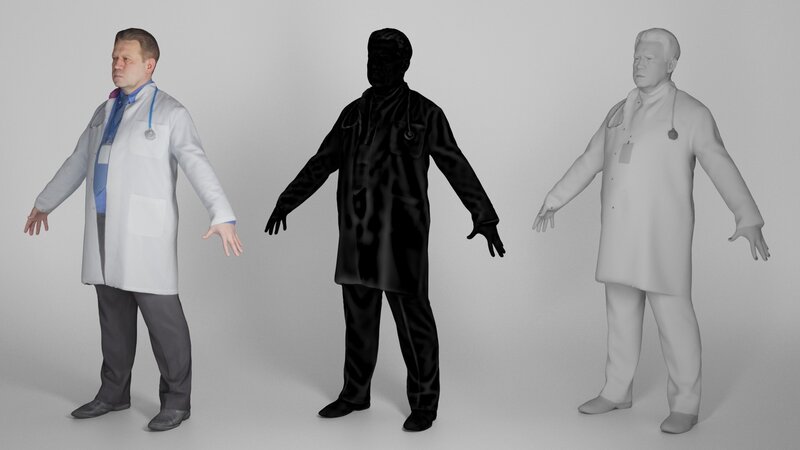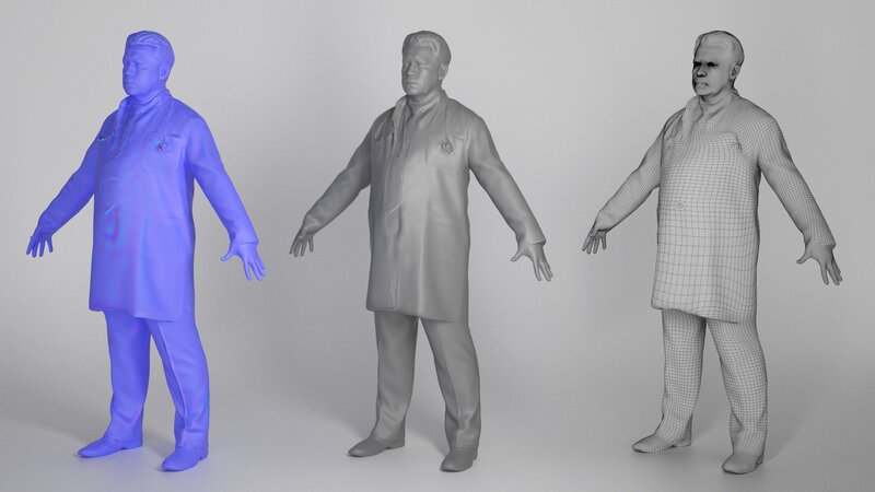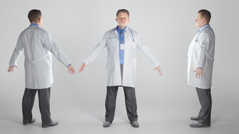 This is a true human size and detailed model of a man of Caucasian appearance dressed in a uniform of a medical doctor. The model is captured in the A-pose with mesh ready for rigging and animation in all most usable 3d software.