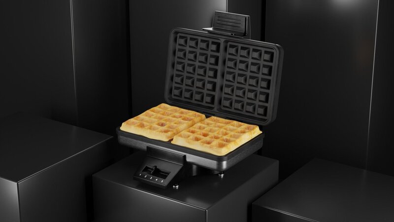 Introducing the perfect blend of elegance and functionality - the Photorealistic 3D Scene featuring a sleek black electric waffle maker. This stunning scene showcases two freshly baked waffles resting delicately within the appliance, perfectly complemented by a stylish minimalist dark setting.