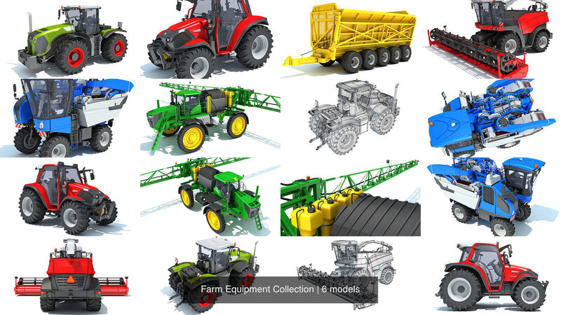 High detailed 6 farm equipment 3d model collection.For additional info, wireframes and more preview renders, or if you want to get separate models, please search our catalog.