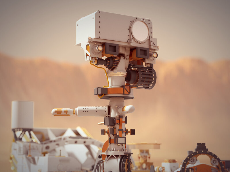 High quality and very detailed 3d model of NASA Perseverance Rover. Scene includes martian surface and crater.