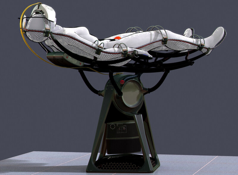 Two versions provided: Mental Ray with Arch & Design and Scanline with standard Max materials. A mannequin is included. The model poly count given is for the unsubdivided hammock only. Model is animated with bracelet unlocking and a skinned visor cable. Model has diffuse, specular and bump mapping. HDR used for reflections. Model is adapted for realtime graphics, all textures power of two, standard Max materials used. Rendered in Scanline mode, model will render as seen in previews. Lense effects added in Photoshop. Layered PSD maps included for customisation.